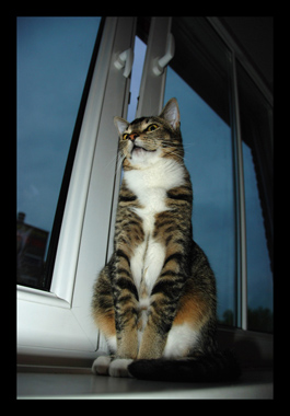 Blitz (wit cyperse kater, mei 2009) werd in een lege vissenkom op een pellet gevonden, waarschijnlijk afkomstig uit een vrachtwagen uit Polen (waar wij net op vakantie waren geweest, hoe toevallig!). Hij was nog maar een paar dagen oud toen ze hem helemaal alleen vonden. Het dierenasiel uit Woerden heeft Snellie – zo werd hij toen genoemd, een verbastering van het vrachtwagenbedrijf waar hij in de buurt gevonden was – een veilig plekje gegeven bij een gastgezin. Zij hebben hem met de fles groot gebracht, en toen Snellie drie weken oud was hebben we elkaar voor het eerst ontmoet. Uiteraard konden we toen geen nee meer zeggen tegen dat kleine bolletje pluis, en met 7,5 week oud kwam Snellie, toen omgedoopt tot Blitz, bij ons in huis. Blitz is nu onze grote dondersteen volop energie en ontzettend nieuwsgierig. Hij houdt van de boel slopen, het apporteren van aluminium balletjes en drinken en spelen met water uit de kraan. Het liefst zwaait hij ons uit als we de deur uitgaan, maar eigenlijk is het aanrecht verboden terrein en dat weet hij donders goed!