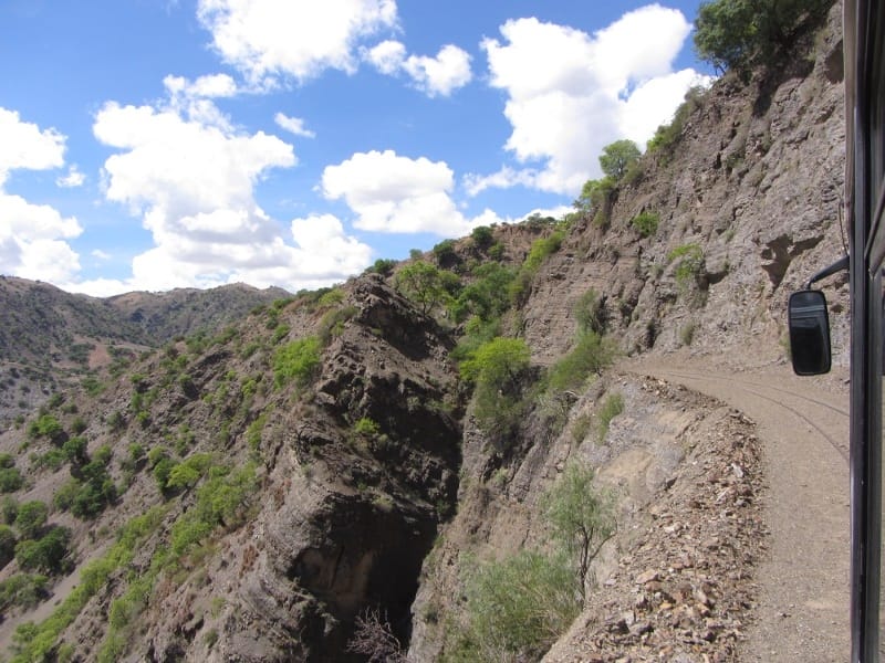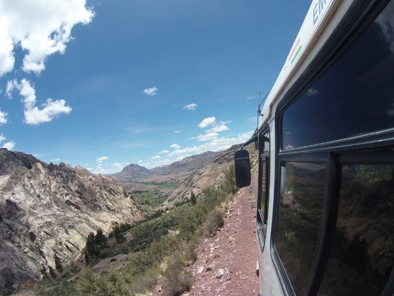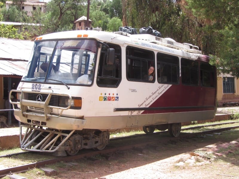 De zitplaatsen waren helaas op dus we moesten staan tot er een plekje vrij kwam, dat namen we maar voor lief als onderdeel van het avontuur… We streken neer op het stationnetje tussen de lokale bevolking en spelende honden en iets voor achten kwam daar dan de buscarril aangereden, een soort bus op het onderstel van een trein. De bagage ging boven op het dak en binnenin waren zo’n 20 zitplaatsen. De route was fantastisch, gedurende 150 km (ruim 6 uur) reden we tussen bergen door en af en toe passeerden we een minidorp. We werden achtervolgd door blaffende honden, zagen vogeltjes in verschillende felle kleuren, er stonden ezels en mensen op het spoor, een berg zand op het spoor werd met een schep weggehaald en we reden vlak langs diepe afgronden… En dat met zo’n 25 km/u. Na ongeveer een uur kwamen er zitplekjes voor ons vrij en halverwege was de buscarril zo vol, dat hij zelfs onderweg mensen moest laten staan. Dat vonden we wel vervelend, want de buscarril is een belangrijk vervoersmiddel voor deze mensen en rijdt maar 3x per week.