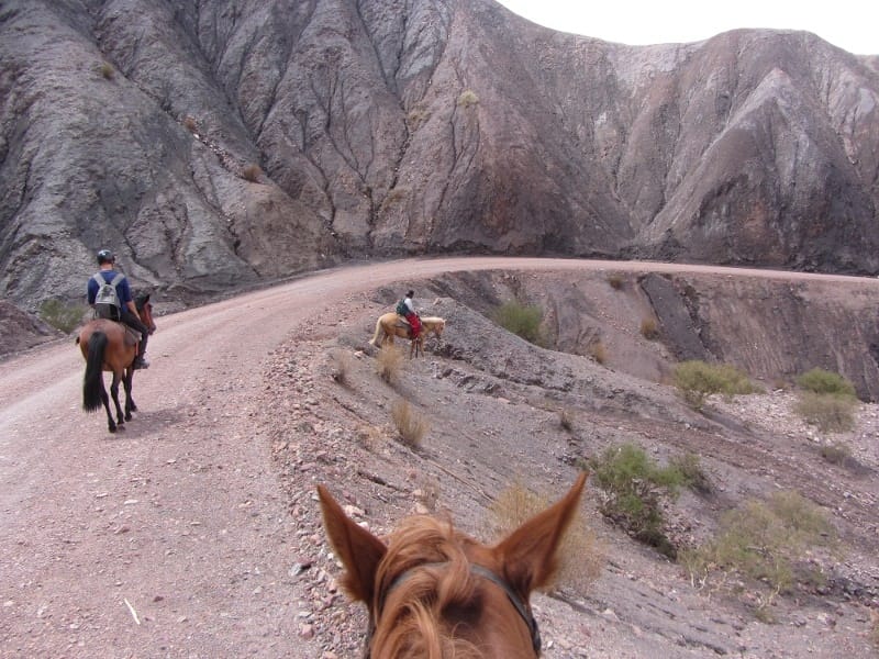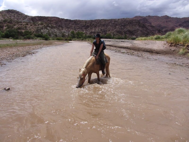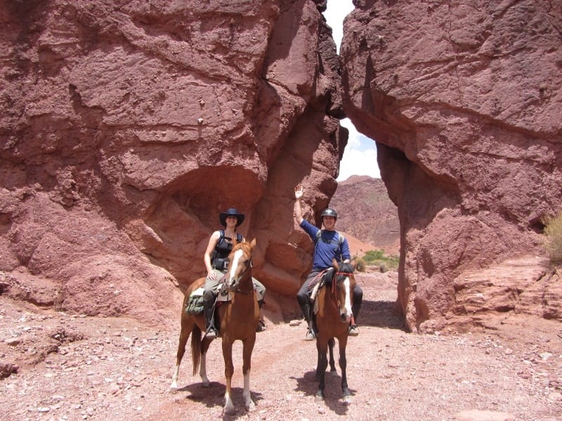 De eerste paardrijdag begon goed, we moesten lopend naar de paarden toe want de brug was afgezet en ze hadden vervoersproblemen? Na zo’n 20 minuten lopen zagen we de paarden, een bruine merrie voor Tijl, een vos voor mij en een blonde 3-jarige hengst voor de gids waar ik de 2e dag op zou rijden. De route was prachtig, tussen cactussen en rode rotswanden door, door rivieren en uitgestorven dorpjes waar blaffende honden ons welkom heetten. Onze Spaans-sprekende gids zei helaas niet meer dan de namen van belangrijke bezienswaardigheden. Na 25 km in stap (geloof me, draven en galopperen met een rugtas op is niet prettig) kwamen we aan bij de rand van een uitgestorven dorpje. Hier kregen we te eten (de helft van Tijls bord belandde stiekem in de maag van de bedelende hond) en sliepen in een soort slaapzaal, heel eenvoudig maar prima. Het was enorm donker en de sterren waren goed te zien. De tweede dag startten we met zadelpijn, het tuig is hier toch wat minder comfortabel dan in Nederland… De omgeving maakte het al snel goed en we deden zelfs een galopje langs de rivier. Het laatste stuk van de route was langs een spoorlijn, lang en saai en langzaam aan deed alles pijn. Na weer zo’n 25 km waren we blij dat we terug waren en op z’n Boliviaans was ons vervoer natuurlijk niet geregeld dus konden we nog een half uur terug naar ons hostel lopen. Blij waren we met de warme douche en een knapperige pizza.